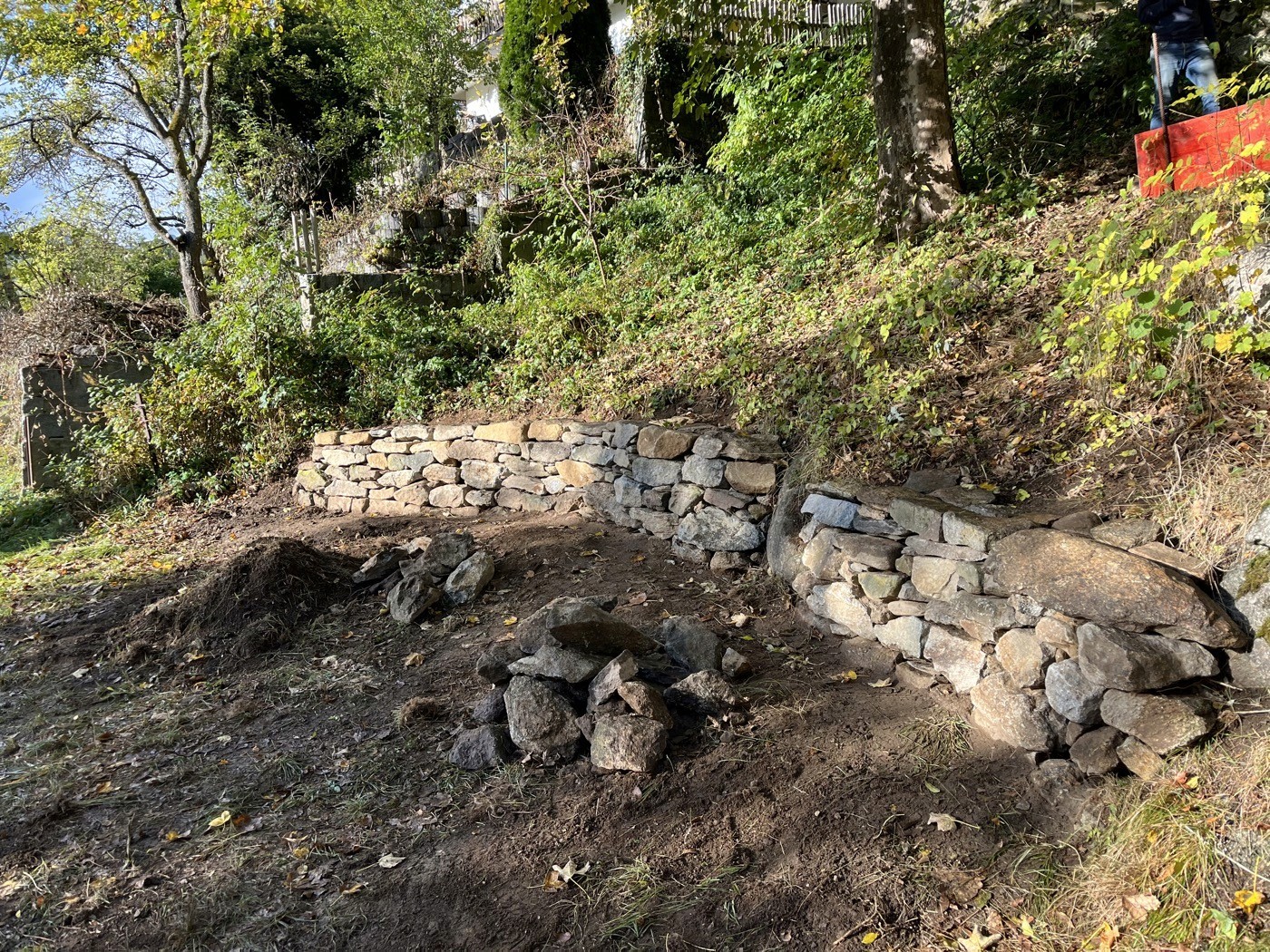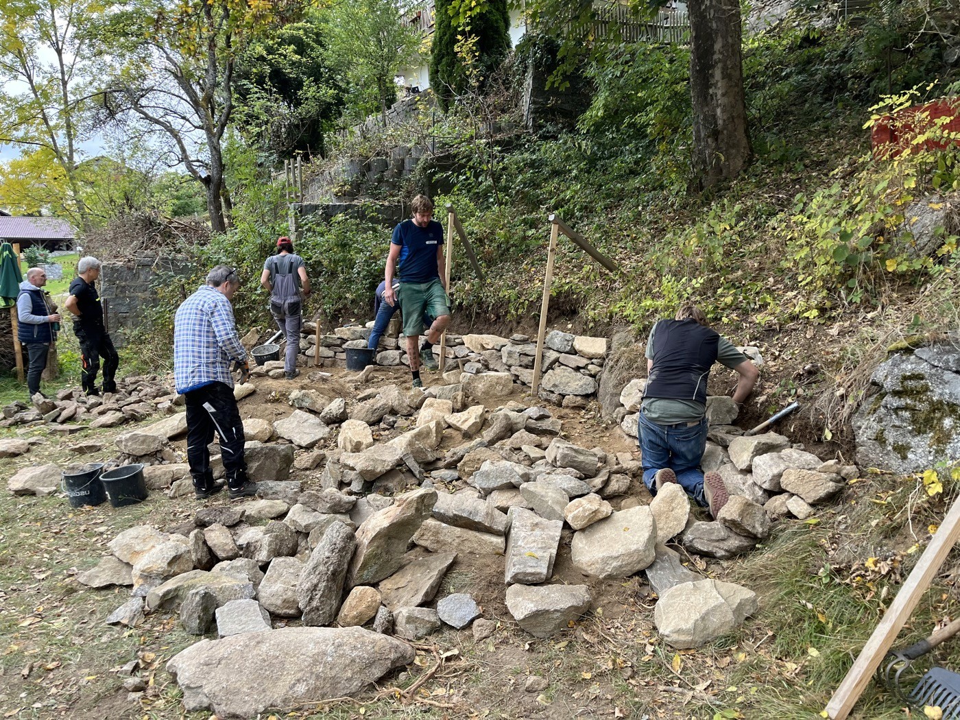 Auf die Steine, fertig … los: Nach diesem Motto fand diesen Oktober der erste Trockenmauerkurs in Bischofsmais, im Bayerischen Wald statt. Unter der Leitung von Rainer Vogler (Österreich) und André Besimo (Schweiz) bauten 12 engagierte Teilnehmer:innen eine Stützmauer. Das Baumaterial kam großteils direkt von einem Fels auf dem Grundstück, der Rest wurde aus ca. 1 km Umkreis zugeführt.